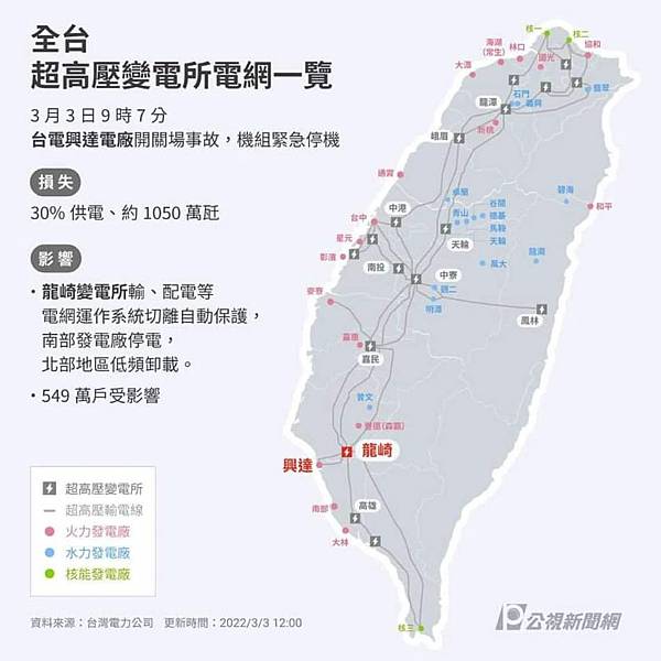 〔記者林菁樺/台北報導〕303大停電因台電興達電廠機組出現人為操作失誤,干擾到鄰近台南「龍崎超高壓變電所」運作,而龍崎超高壓變電所其實是台灣三大電力樞紐之一,重要地位不言可喻。