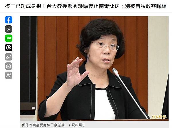 核三已功成身退!台大教授鄭秀玲籲停止南電北送:別被自私政客矇騙 - 政治 - 自由時報電子報 https://bit.ly/4fDNSjz