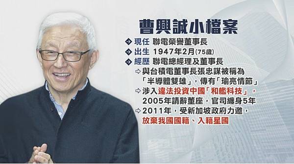 聯電創辦人曹興誠出生於北京,一歲半時隨父母到台灣,臺灣大學電機系學士,交通大學管理科學研究所碩士,曾任工研院電子所副所長、聯電總經理與董事長、海峽兩岸商務發展基金會董事、總統府國策顧問等。