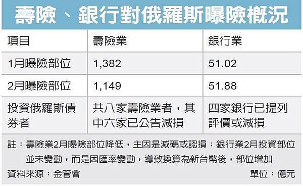 據統計,2月壽險業對俄羅斯曝險為1,149億元、銀行業為51.8億元,合計曝險部位1,200.8億元,若與1月相較,壽險業曝險降、銀行業則反向增加。