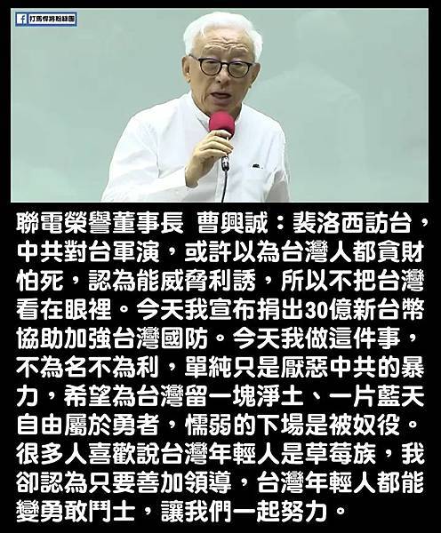 曹興誠表示,面對中共威脅情勢,台灣有一些人主張要去和談,這是非常危險的。和談能讓中共修改憲法嗎?如果不能讓她們修改侵略台灣的憲法,去和談只會示弱和討饒,這樣反而會增加中共進攻台灣的信心和決心。