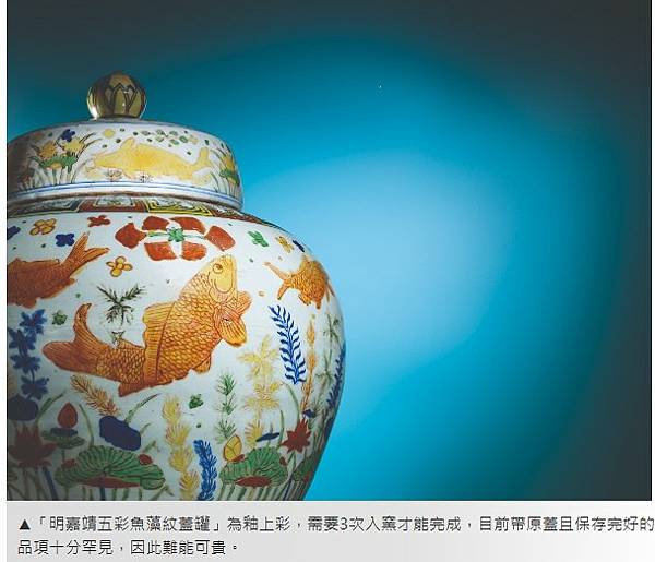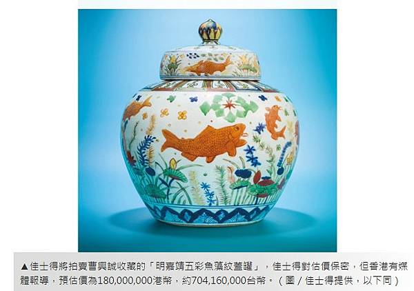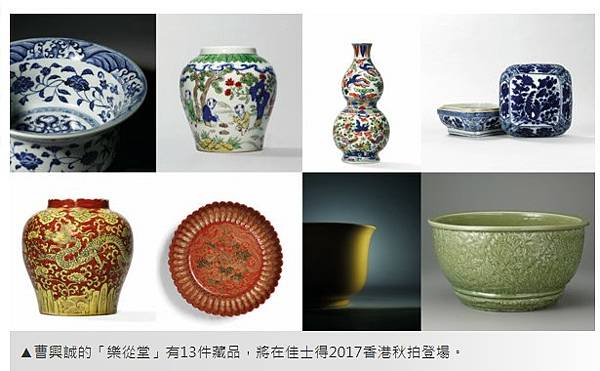 2017年佳士得香港秋拍,曹興誠的「明嘉靖五彩魚藻紋蓋罐」,在5分鐘內即以2.14億港幣(約8.22億台幣)成交,而先前他提供給蘇富比的「北宋汝窯天青釉洗」,更以2.6億港幣(約10億台幣)落槌,加上佣金超過11.5億台幣,刷新宋瓷世界拍賣紀錄。前者多彩、後者極素,兩件各自精彩。