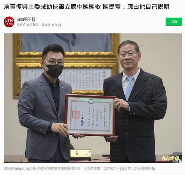 前黃復興主委臧幼俠肅立聽中國國歌 國民黨:應由他自己說明 | 自由電子報 | LINE TODAY