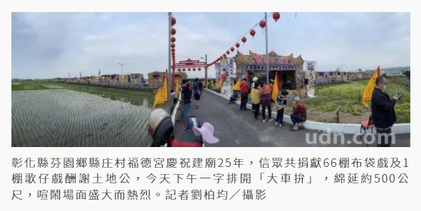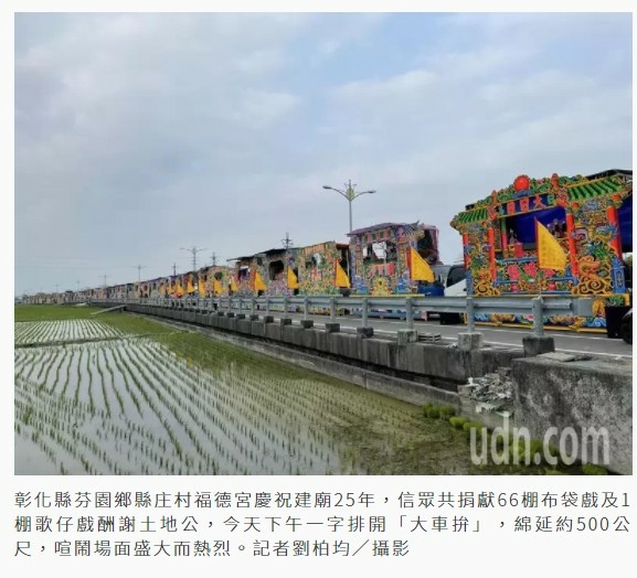 彰化縣芬園鄉縣庄村福德宮慶祝建廟25年,信眾共捐獻66棚布袋戲及1棚歌仔戲酬謝土地公,今天下午一字排開「大車拚」,綿延約500公尺,喧鬧場面盛大而熱烈,福德宮主委郭哲榮說,如此盛大場面是芬園所僅見,祈求土地公庇佑信眾平安發財。