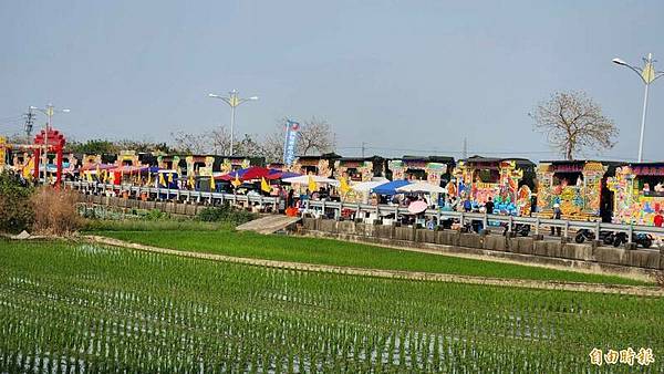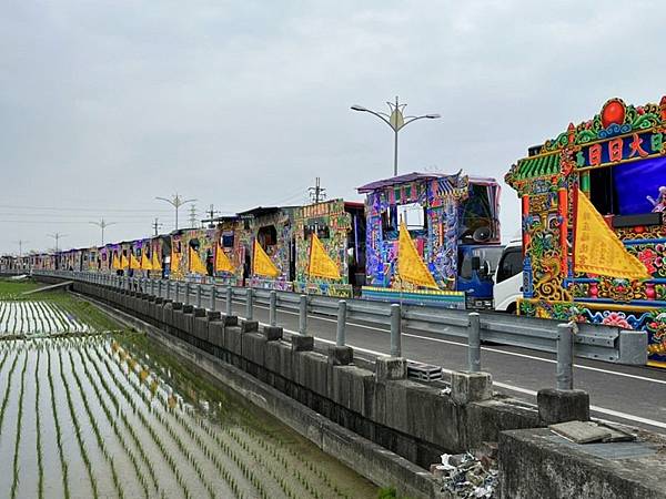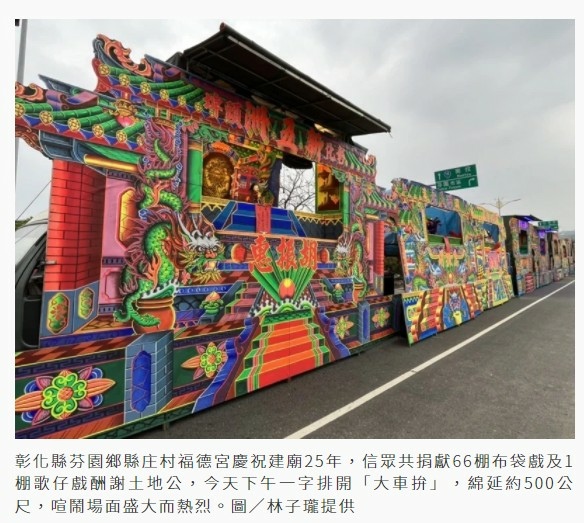 彰化縣芬園鄉縣庄村福德宮慶祝建廟25年,信眾共捐獻66棚布袋戲及1棚歌仔戲酬謝土地公,今天下午一字排開「大車拚」,綿延約500公尺,喧鬧場面盛大而熱烈。圖/林子瓏提供