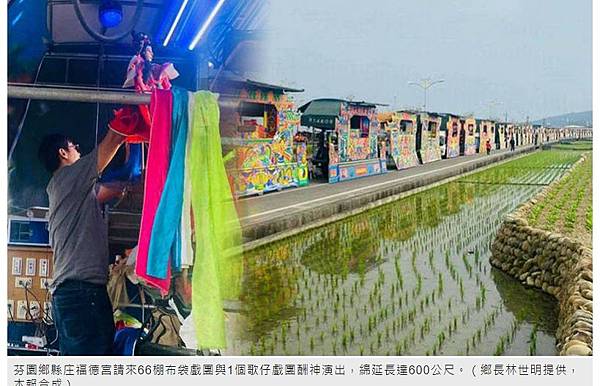 芬園鄉縣庄福德宮請來66棚布袋戲團與1個歌仔戲團酬神演出,綿延長達600公尺。(鄉長林世明提供,本報合成)