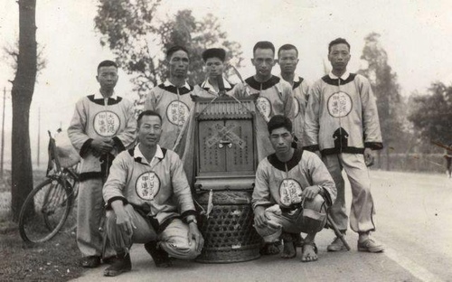 大甲媽祖南下北港進香火坩房合影民國五十四年三月/(1965) 日治大正十年(1921)左右,大甲媽祖開始至北港進香,火坩房則肩負著北港進香活動中最神聖的儀式-「刈火」的重責大任;「刈火」時,朝天宮「萬年香 火」爐內的香火,由火坩房人員杓進火坩後,便將之放入「火坩龕仔」,由和尚貼上封條,便由火坩房人員護送回大甲,擲筊擇日進行「合火」,儀式通常在午夜時 分進行。圖中所示「火坩龕仔」上已貼上封條,表示為回程中所攝。火坩龕仔下方為「棕籠」,籠內放置「束柴」、「茶箍」等物品,回大甲途中由火坩房人員,從 「火坩龕仔」後方約十五公分的圓洞,持續添入「束柴」、「茶箍」,以維香火不滅。前排右者張日益、左者陳東城,後排右三張澤淮、左一陳媽安。