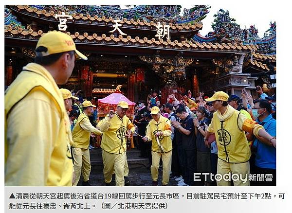 「白沙屯媽祖徒步進香」為國家級無形文化資產之重要民俗,迥異於各媽祖廟鑼鼓喧騰的進香活動,並具有「一切聽憑神意而決」的獨特性,尤其進香隊伍行走的路線、媽祖鑾轎休息過夜的地點,必須在隊伍行進時,由媽祖神意透過神轎的搖晃方式指示。清晨從朝天宮起駕後沿省道台19線回駕步行至元長市區,目前駐駕民宅預計至下午2點,可能從元長往褒忠、崙背北上。