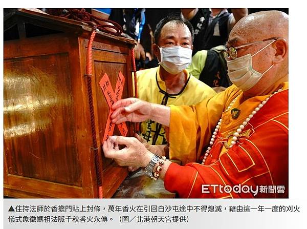 ▲住持法師於香擔門貼上封條,萬年香火在引回白沙屯途中不得熄滅,藉由這一年一度的刈火儀式象徵媽祖法脈千秋香火永傳。(圖/北港朝天宮提供)