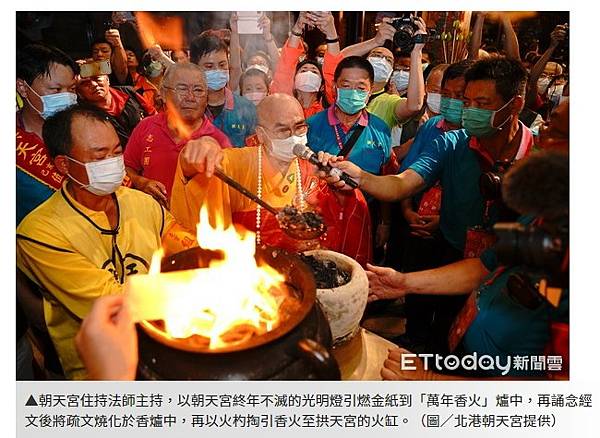 ▲朝天宮住持法師主持,以朝天宮終年不滅的光明燈引燃金紙到「萬年香火」爐中,再誦念經文後將疏文燒化於香爐中,再以火杓掏引香火至拱天宮的火缸。(圖/北港朝天宮提供)