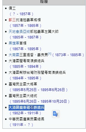 老爺子不簡單。不簡單咱就簡單說,他一生的身份在不停變動:賣苦力的出身,造反的天地會大哥,越南王朝保護者,滿清總兵,台灣民主國大元帥,回鄉頤養天年的大財主。他一輩子就是一部正能量滿滿的人生成功史。