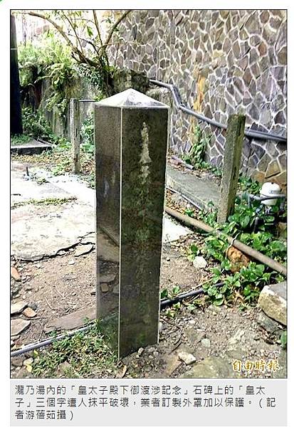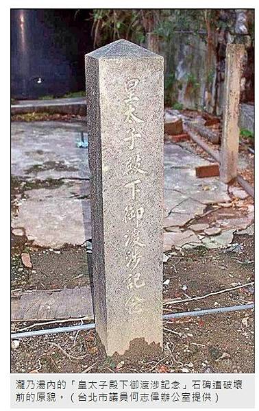 〔記者游蓓茹/台北報導〕位於北投三大名湯之一「瀧乃湯」內的「皇太子殿下御渡涉記念碑」驚傳遭到破壞,石碑上的「皇太子」三個字被抹平,店家為了保護石碑,罩上透明塑膠蓋,卻讓濕氣凝結於內,讓整個石碑「四不像」,市議員何志偉與文史學者就痛批,石碑明明已決議要捐回北市府,卻遲遲拖延、造成破壞,「北市府明顯失職」。