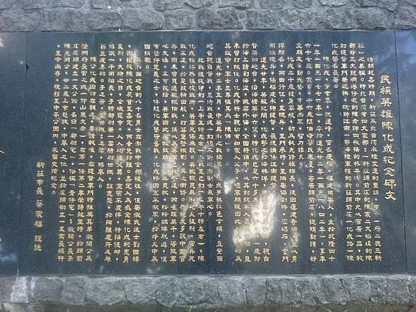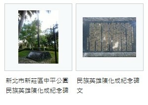 在臺灣,陳化成曾隨伯母蔡氏移居新莊頭前莊,庄內的主要道路被命名為「化成路」。[7]:256、474陳化成姪子陳光淵中舉之後,在頭前庄內豎立旗桿紀念,後被移至中平公園,新莊市長蔡家福立有〈民族英雄陳化成紀念碑文〉。陳化成 - 維基百科,自由的百科全書 https://bit.ly/3J5DMH2
