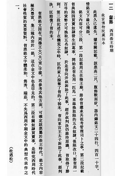 此鼎為西周恭王時期器物。久已遺失,僅存銘文拓本下緣殘泐,大篆。銘文茂密樸實,厚重凝練,有古拙雄偉之氣,是西周中葉銅器銘文中最為精美的一章。