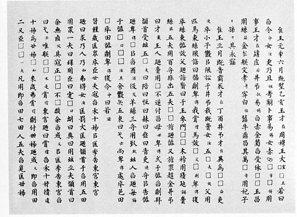 昔饉歲,匡眾厥臣廿夫,寇曶禾十秭。以匡季告東宮,東宮乃曰:求乃人,乃弗得,汝匡罰大。匡乃(稽)首,於曶用五田,用眾一夫,曰嗌,用臣曰疐、□曰胐、曰奠,曰用茲四夫。(稽)首曰:余無卣(由)具寇正(足)□禾,不出,(鞭)余。曶或(又)以匡季告東宮,曶曰:弋唯朕□禾賞(償)。東宮乃曰:賞(償)曶禾十秭,(遺)十秭,爲廿秭,□來歲弗賞(償),則付卌秭。廼或(又)即曶,用田二,又臣□一,凡用即曶田七田、人五夫,曶覓匡卅秭。