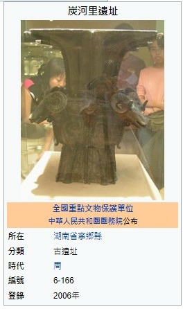 炭河里遺址坐落在湖南省長沙市寧鄉市黃材鎮,是南方著名的青銅器出土地。[1]年代約為商朝到西周時期。寧鄉位於長江以南,卻有大量珍貴的青銅器出土。這是中國歷史界的一個還沒有解開的謎。