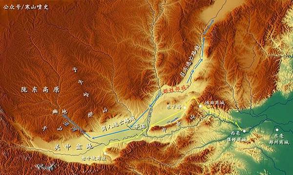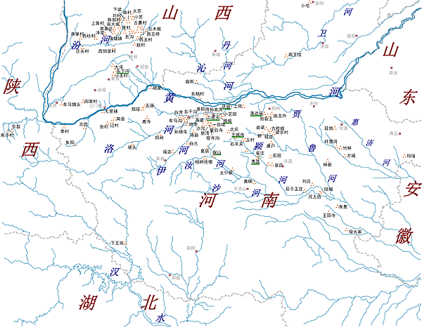 姜姓的另一支可能是從嵩山以西進入關中地區。《後漢書·西羌傳》:「西羌之本,出自三苗,姜姓之別也。」如前所述,豫西地區和陝西東南部本來就是姜、夏兩族所活動的九州六險範圍,因此,姜姓族由此進入關中地區是很自然的。沿豫西的伊河往西走經欒川,便進入陝西東部地區的丹江,再溯江西北而上,經商南、丹鳳、商縣,便可達藍田。沿豫西的洛河往西走,經盧氏縣便進入陝西境內的洛河,溯江而上經洛南市亦直達藍田。再由藍田往西走便是長安,由此可進入渭水流域的武功、扶鳳。