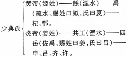 周與夏同源,姜亦與夏有關。據《國語》可知,姒姓的夏與姜姓族同時受封於夏禹之時,而其遠祖則為黃帝與炎帝。《國語·晉語四》:「昔少典氏取於有}氏,生黃帝、炎帝。黃帝以姬水成,炎帝以姜水成;成而異德,故黃帝為姬,炎帝為姜。」《國語·周語下》:「昔共工棄此道也,虞於湛樂,淫失其身;欲壅防百川,墜高堙卑,以害天下。皇天弗祝,庶兄弗助;禍亂並興,共工用滅。其在有虞,有崇伯播其淫心,稱遂共工之過。堯用殛之於羽山。其後伯禹念前之非度,釐改制量,象物天地,比類百則,儀之於民,而度之於群生。共工從孫四岳佐之,高高下下,疏川導滯,鍾水豐物。……皇天嘉之,胙以天下,賜姓曰姒,氏曰有夏;謂其能以嘉祉殷富生物也。祚四岳國,命以侯伯,賜姓曰姜,氏曰有呂;謂其能為禹股肱心膂,以養物豐民人也。……有夏雖衰,杞鄫猶在。申呂雖衰,齊許猶在。唯有嘉功,以命姓受祀,迄於天下。……皆黃炎之後也。」《國語·周語中》:「齊許申呂由太姜。」由上所述,可得其關係如下: