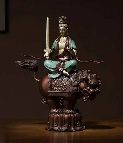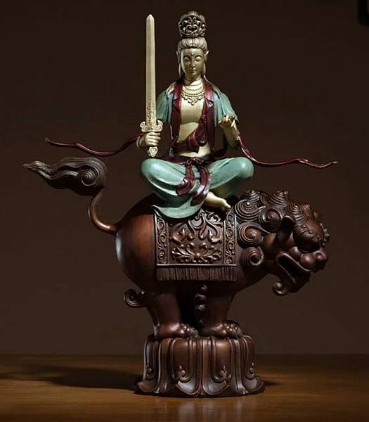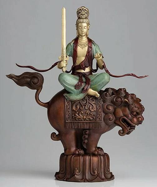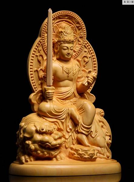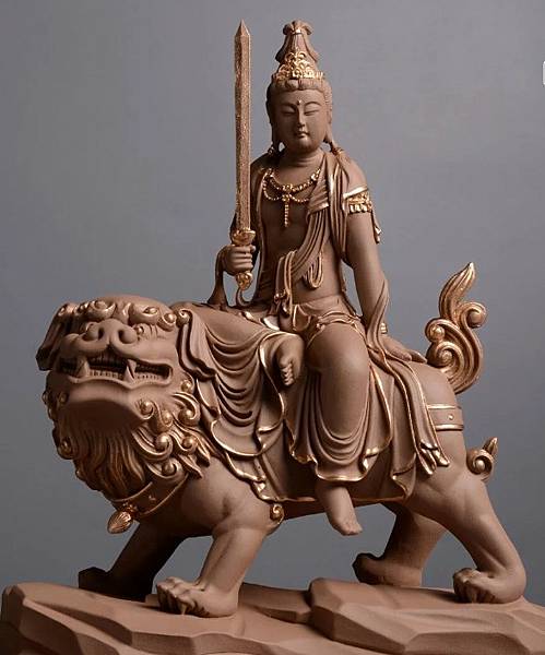 文殊在佛教中是智慧的象徵,其注重一切般若,被稱智慧第一。文殊的標準形象爲乘青獅、持寶劍(有時換為玉如意,表示吉祥),騎獅表威猛,執劍表智慧。一般在造像中,文殊作為脅侍位於釋迦佛的左側,與釋迦牟尼佛、普賢菩薩並稱為華嚴三聖。