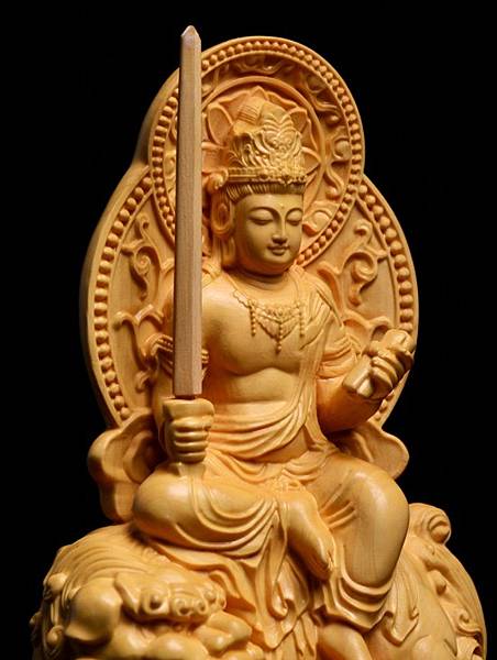 持劍在佛教中有重要表徵意義,象徵以智慧劍斬煩惱結。在玄奘所譯的《能斷金剛般若波羅蜜經》中,把般若比喻作能斬斷金剛的利器,文殊師利就是智慧的化身,祂自己的非凡成就以及教人成佛之豐功偉業,無不是憑藉著智慧這把利劍。學佛者無不祈望深入經藏,智慧如海。只有修智慧,才能明是非,除十惡,修十善,離塵垢,淨性體,度有情,入涅槃。而這把利劍,就是透過五蘊,照見空性,色空不二,有無圓融,一行三昧,常樂我淨。