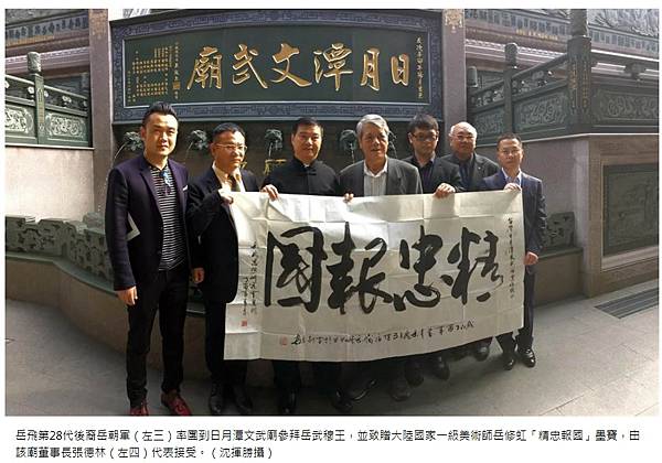從事能源發展業的岳朝軍,目前同時擔任岳飛思想研究會、岳飛文化交流協會及中華岳飛文化基金會3大社團的理事長、會長,為岳氏後裔核心人士,且28代之輩分尊高;大陸國家一級美術師岳修虹為第31代,岳修虹特別寫了1幅「精忠報國」墨寶,由岳朝軍致贈日月潭文武廟。