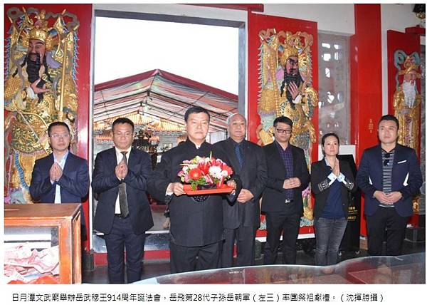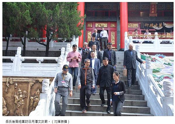 岳朝軍一行人,今天上午由岳氏在台後裔岳永文及日月潭文武廟董事長張德林、總經理黃宋華、廟務組長黃國村與童萬益陪同,先參拜至聖先師孔子,隨後在拜殿向岳武穆王跪叩,並獻花獻果。