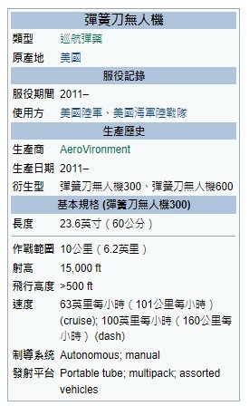 「神風敢死隊」彈簧刀無人機性能諸元︰