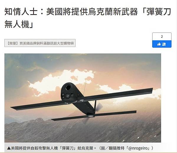 報導說,美國送出這款武器給烏克蘭,代表軍事援助已進入另一個階段。軍事專家稱它為「會飛的散彈槍」;一名資深官員認為美國送出一套很有破壞力的武器,它重量輕、體積小,可以裝進一個後背包,每架成本不到6000美元。絕命武器來了!美國送烏克蘭彈簧刀無人機 能俯衝轟炸目標 - 新聞 - Rti 中央廣播電臺 https://bit.ly/3IcRPtm