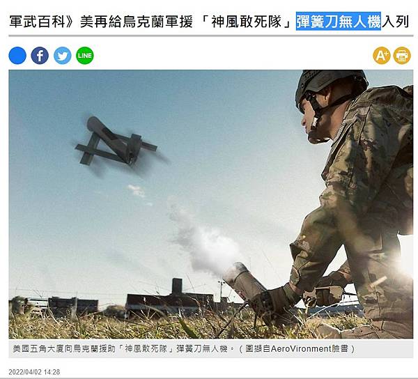 〔即時新聞/綜合報導〕美國五角大廈4月1日宣布提供烏克蘭價值3億美元(約新台幣86億元)的物資援助,其中包括被稱為「神風敢死隊」的彈簧刀無人機(Switchblade),無疑為烏軍再添對敵利器。