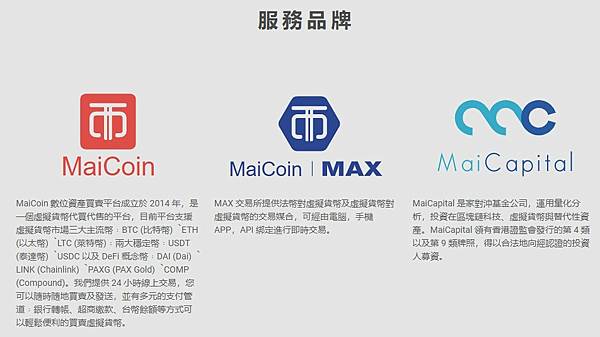 MaiCoin 集團為台灣歷史最久數位資產交易集團,提供各項數位資產的交易服務,包含 MaiCoin 數位資產買賣平台、MAX 數位資產交易所、MaiCapital。MaiCoin 集團自 2013 年開始運營其數位資產經紀業務,2014 年 MaiCoin 平台正式上線提供用戶使用新台幣購買比特幣等數位資產,也是台灣第一個提供以太幣(ETH)、萊特幣(LTC)等兌換新台幣的交易平台。