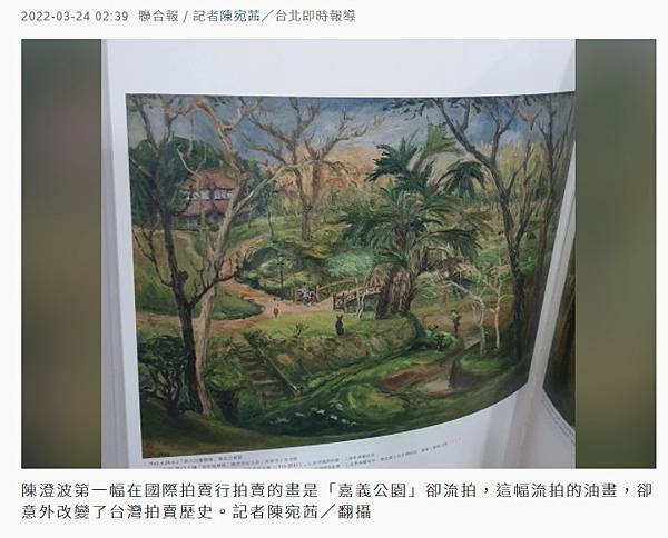 陳澄波第一幅在國際拍賣行拍賣的畫是「嘉義公園」卻流拍,這幅流拍的油畫,卻意外改變了台灣拍賣歷史。記者陳宛茜/翻攝