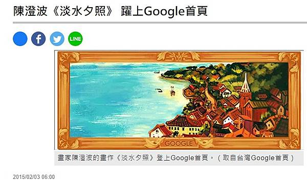〔記者楊媛婷/台北報導〕昨天連上谷歌(Google)首頁,不少網友看到首頁圖像是一幅畫,點進去一看,才知是有「台灣梵谷」之稱的畫家陳澄波的《淡水夕照》,該畫曾創國內藝術家拍賣價值最高紀錄,總值二.一億元。谷歌放上陳澄波的畫作,再度喚起國人對這位死於「二二八事件」的大師回憶。