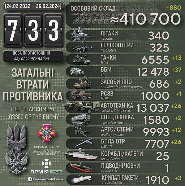 俄烏戰爭26日進入第733天,烏克蘭統計俄軍陣亡人數累計已破41萬大關,對比總統澤倫斯基前一天公開烏軍兵損,兩年來共3.1萬人為國捐軀,俄烏兩軍陣亡比達到逾13比1 戰損比 https://bit.ly/49PBQQ5
