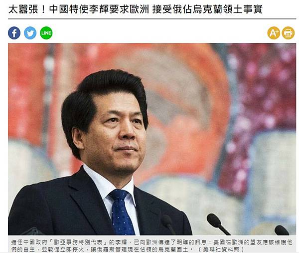 太囂張!中國特使李輝要求歐洲 接受俄佔烏克蘭領土事實 - 國際 - 自由時報電子報