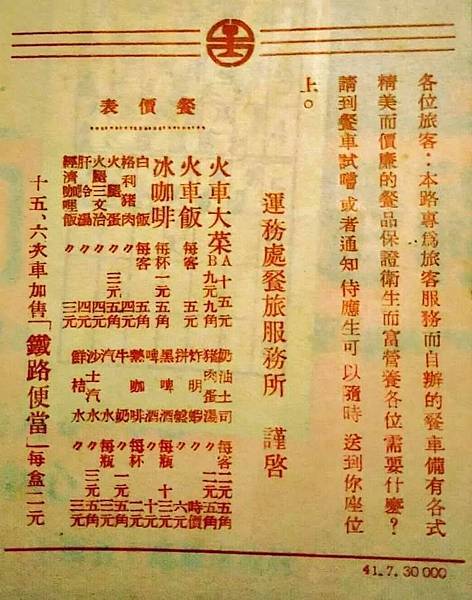 (7) 哲生原力 | 民國41年火車上餐車的餐飲價目表、大菜a為15元、b為9.5元 | Facebook