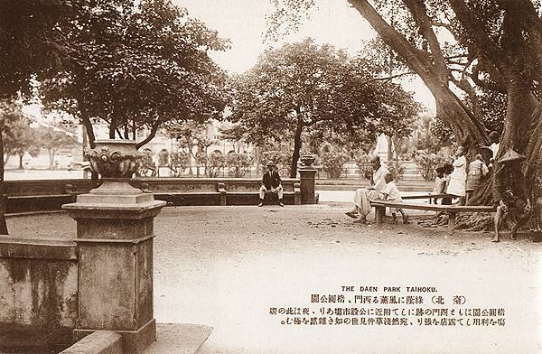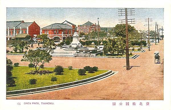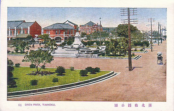 1920年代的台北橢圓公園。畫面中間上方的尖頂紅色建築為西門紅樓,畫面右側人力車行走的道路為今成都路,與其垂直的大馬路(銅像前方的道路)就是現在的中華路。