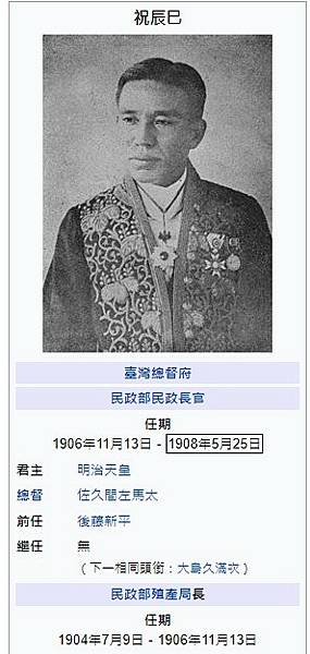 祝辰巳(1867-1908)於明治39年(1906)擔任第四任民政長官,明治41年(1908)殉職。大正元年(1912)於橢圓公園立像。