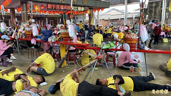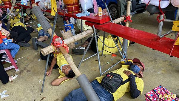 後社集和宮蜈蚣陣是全台唯一用人力扛走的蜈蚣陣,每天需要228人輪流扛行,要走30公里,扛工非常辛苦。(記者楊金城攝)