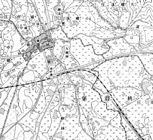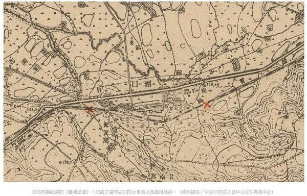 日治時期繪製的《臺灣堡圖》,記載了當時湖口的火車站以及鐵道路線。(資料提供/中央研究院人社中心GIS 專題中心)