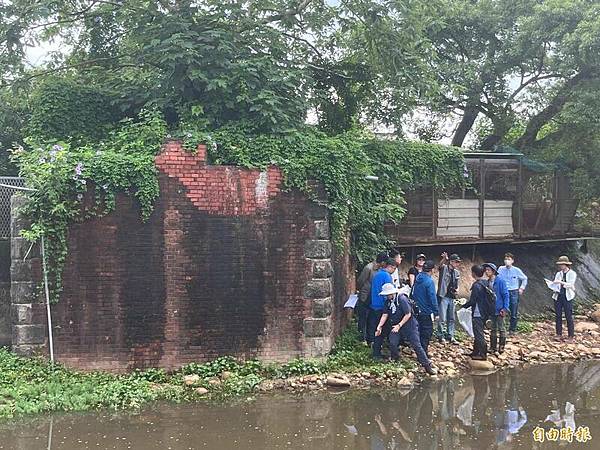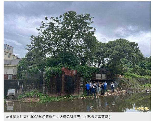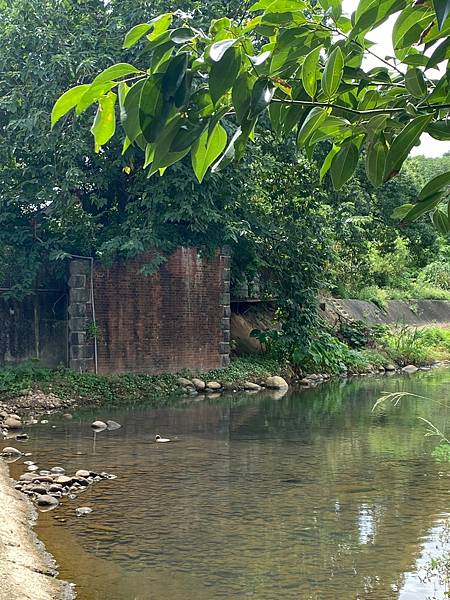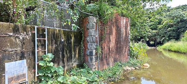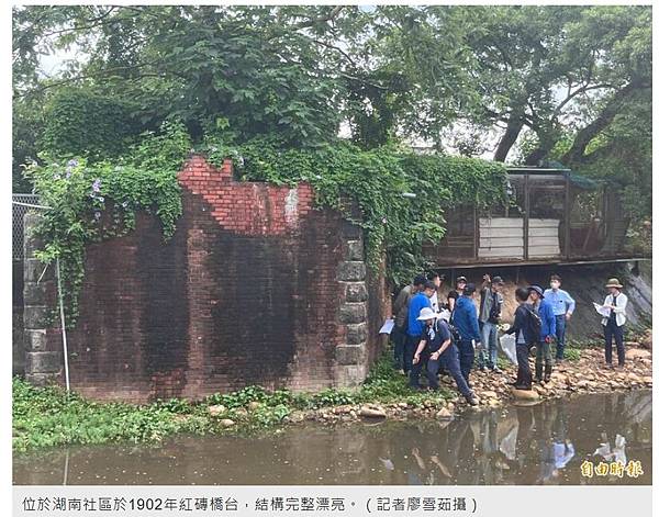 其中,隱身在湖南社區的鐵道橋墩,1893年至今131年仍相當完整,高3公尺寬4.7公尺,斜跨越河道,建築技術很難得;而橋墩的磚塊色澤漂亮,與大石磚交錯,別具美感,尤其倒影在溪水時。