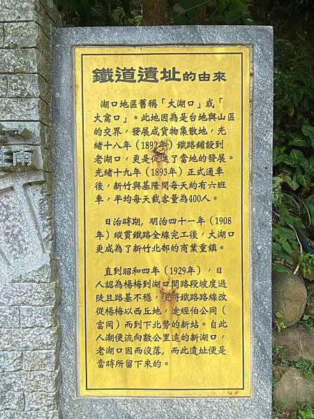 直到昭和四年(1929年),日 人認為楊梅到湖口間路段坡度過 陡且路基不穩,便將鐵路路線改 從楊梅以西丘地,途經伯公岡( 富岡)而到下北勢的新站。自此 人潮便流向數公里遠的新湖口/ 老湖口因而沒落,而此遺址便是 當時所留下來的。 臺灣鐵路 (清朝) - 維基百科,自由的百科全書
