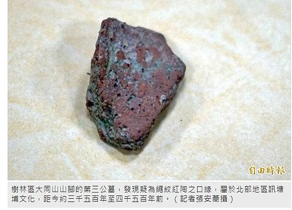 樹林區大同山山腳的第三公墓,發現疑為繩紋紅陶之口緣,屬於北部地區訊塘埔文化,距今約三千五百年至四千五百年前。(記者張安蕎攝)
