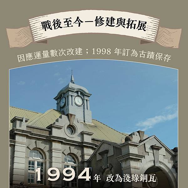 1901年8月艋舺舊站啟用,1918(大正7)年艋舺新車站於舊站南側落成,4月27日在車站內舉行落成式,5月1日開始營運。直行列車也計畫在此站停靠,成為南部貨物進出的倉庫,為日後艋舺發展做出貢獻。1920年車站因行政區改制更名為萬華,戰後1980年代後期遭拆除,現已不存。(1) 聚珍臺灣 - #歷史上的今天 1918年4月27日,艋舺驛新站舉行落成式... | Facebook https://bit.ly/3ng3MKd
