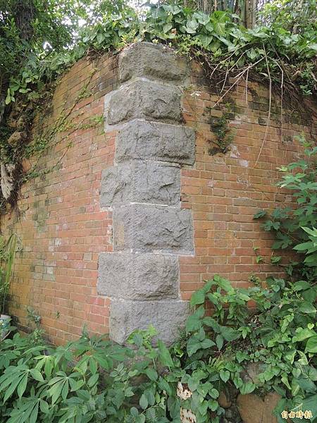 舊鐵道橋墩的磚塊色澤漂亮,與大石磚交錯,別具美感。(記者廖雪茹攝)