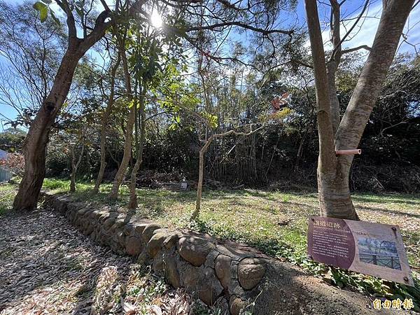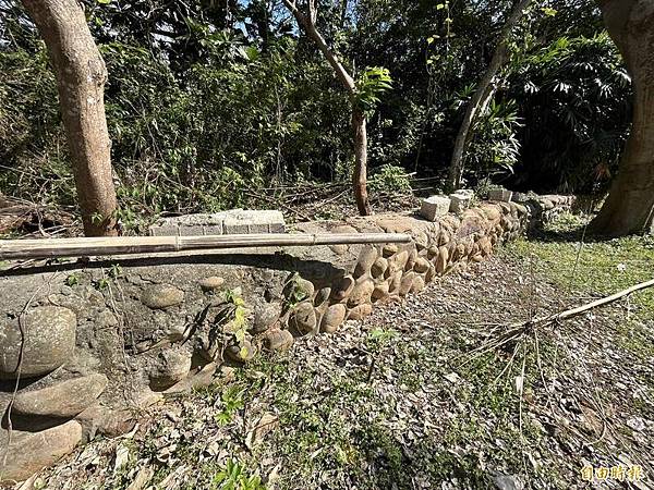 新竹縣湖口老街旁的大湖口車站公園內,留下百年前大湖口火車碼頭的月台石駁坎,文史工作者希望妥善保存,並讓更多人知道這個珍貴的歷史見證位。(記者廖雪茹攝)