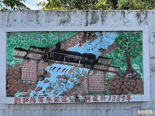 新竹縣湖口鄉湖南社區發展協會爭取設置清代橋墩解說牌,志工創作鐵道橋樑蒸汽火車壁畫,增添鐵道橋墩故事。 (記者廖雪茹攝)