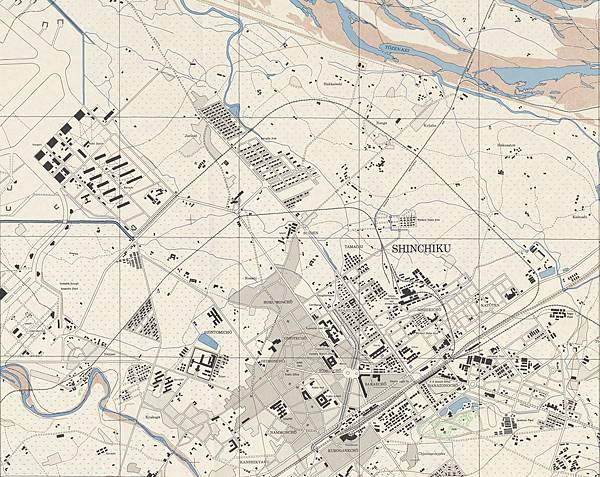 西元 1945年的 《美軍航照圖》中,繞過新竹北方的路線即是新竹機場線。(資料提供:中央研究院人社中心 GIS 專題中心)