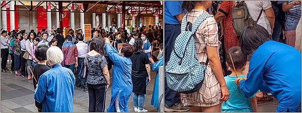 善男信女虔誠的排著隊,靜待「效勞生師兄」幫每一個人消災解厄,一支支虔誠的香、悉心詢問信眾的姓名、每一個步驟都私毫不馬虎的講究──不僅象徵恩主公對信眾的開釋和慰藉,也是許多人化解疑難雜症的依歸──這是行天宮每天再平凡不過的日常,而這樣的「收驚」文化已成了傳統,更是正面積極的能量。