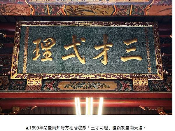 ▲1890年間臺南知府方祖蔭敬獻「三才弌理」匾額於臺南天壇。