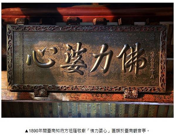 ▲1890年間臺南知府方祖蔭敬獻「佛力婆心」匾額於臺南觀音亭。